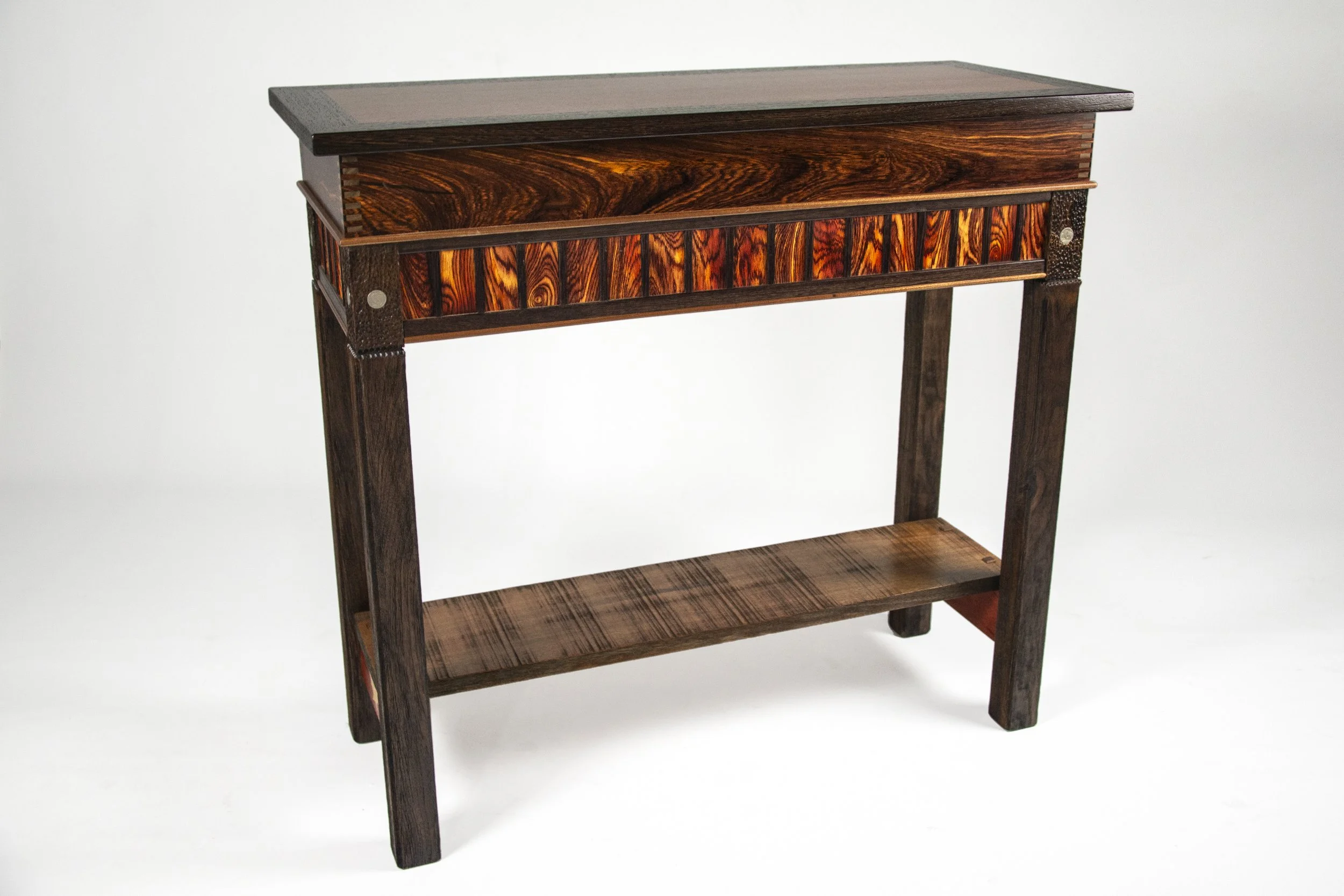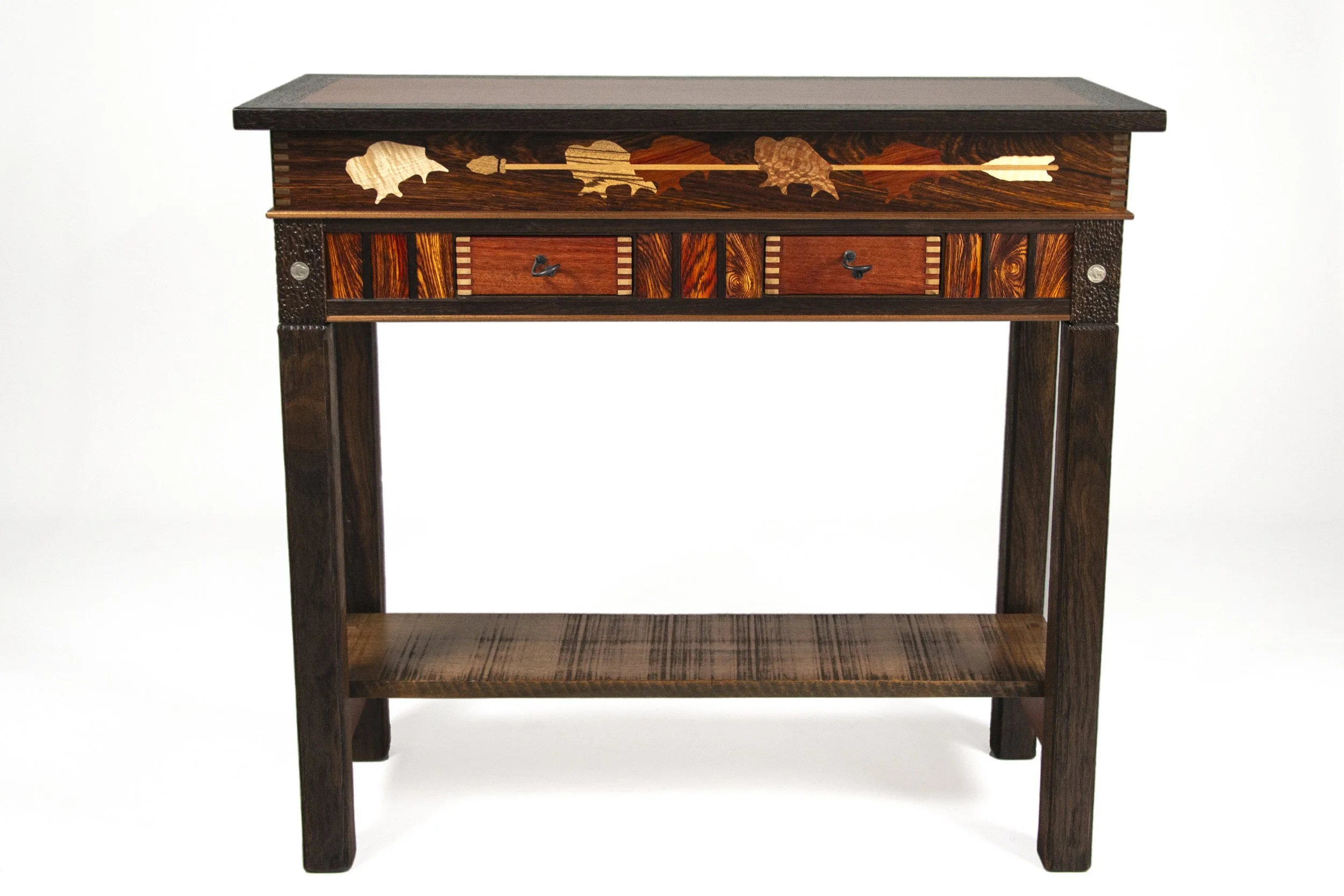 A celebration of the untamed spirit of the American West, the Pursuit of the Spirit Buffalo console table is a masterwork of symbolism and fine craftsmanship. Handcrafted from a stunning blend of bloodwood, wenge, walnut, and cocobolo, this piece tells a story in every grain and inlay.